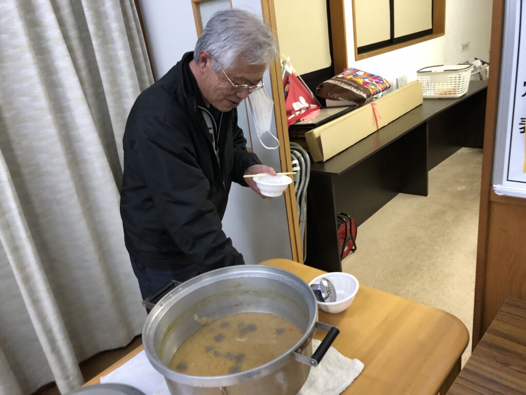 勝ったチ-ムも負けたチ-ムも最後はモツ煮を食べながら一年を振り返りました。